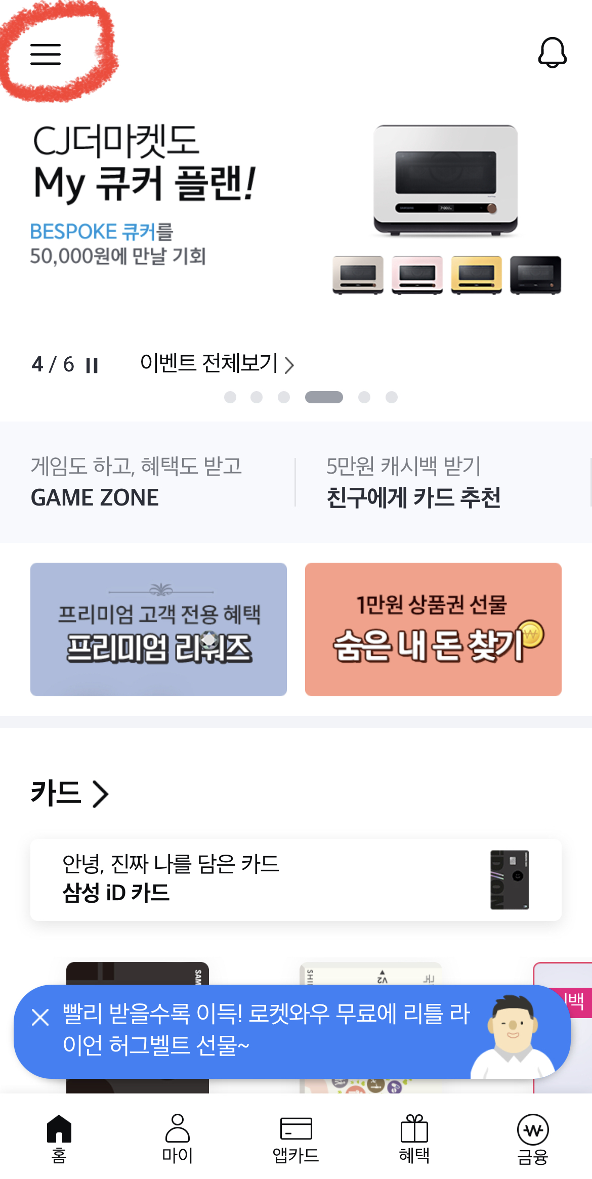 2. 삼성카드 앱 홈 - 왼쪽 상단 ≡ 아이콘